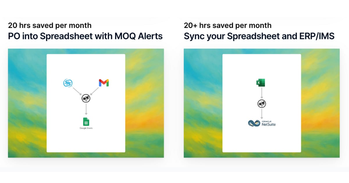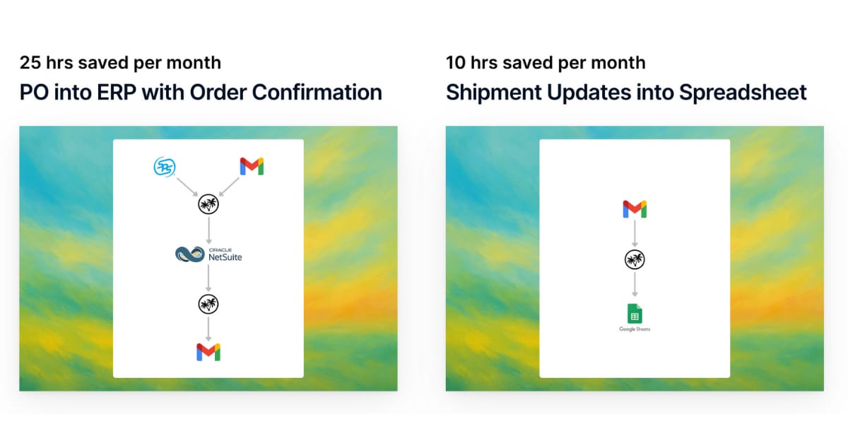 Usually that means taking purchase orders coming in by email or through SPS Commerce and syncing them with a system like Google Sheets or NetSuite.